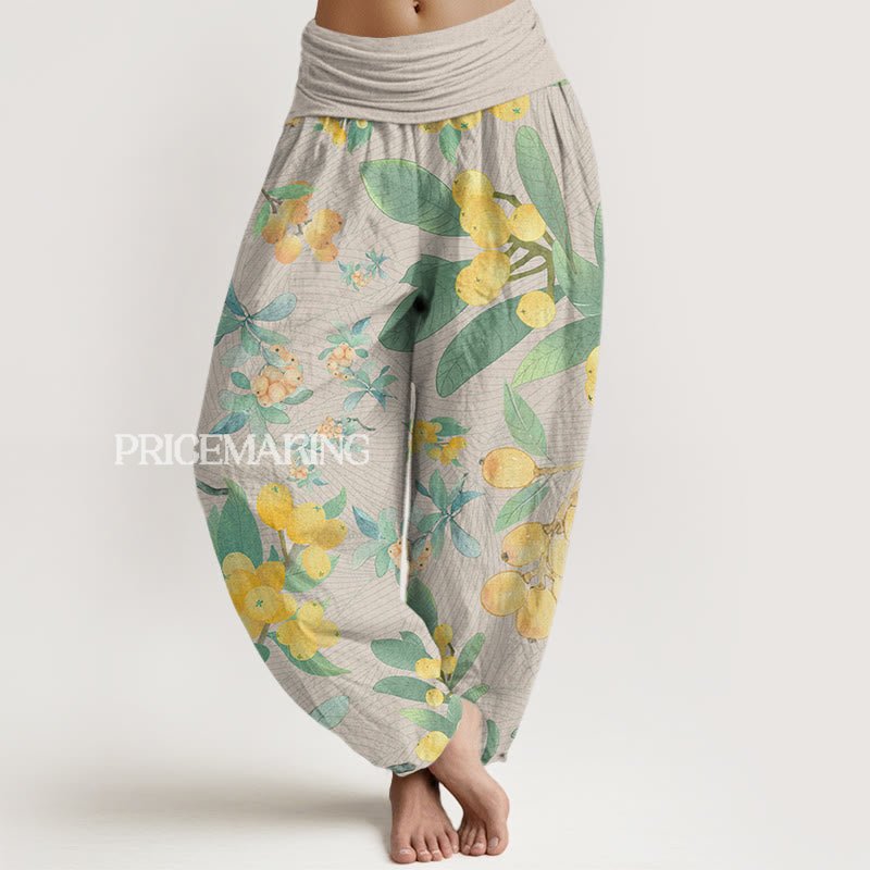 Loquat Pattern Harem Pants feature vibrant yellow floral motifs that bring a lively touch to your day. Designed with a comfortable elastic waistband and a relaxed fit, they provide ease of movement and long-lasting comfort. Crafted from breathable fabric, these pants promote a sense of calm and balance, making them perfect for yoga, meditation, or casual relaxation.💕