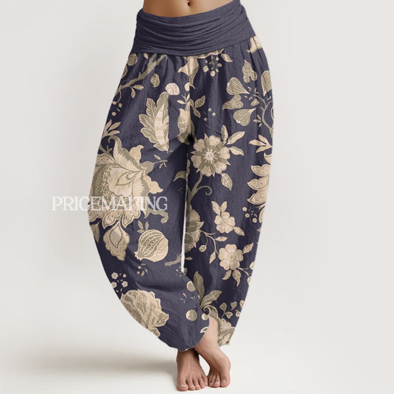 Design: The harem pants feature a detailed floral pattern with large, intricate peonies and delicate smaller blossoms. The design showcases the elegant curves of the peony petals and the soft flow of smaller flowers, creating a harmonious and sophisticated look. The rich texture and movement of the flowers give the pants a graceful and timeless appeal, blending strength and beauty in the design.