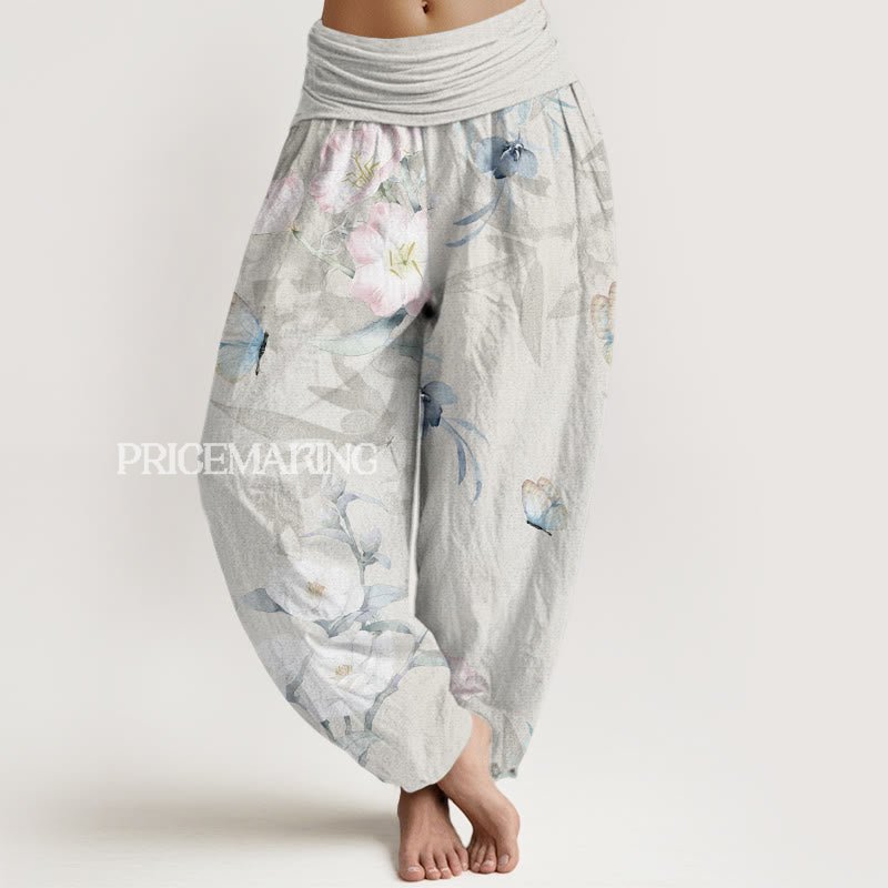 Design: The design of these pants features cherry blossoms and hibiscus flowers in soft pink and white tones, paired with subtle green leaves and delicate butterfly accents. The intricate floral patterns create a serene, nature-inspired look, blending springtime elegance with a touch of tropical charm.