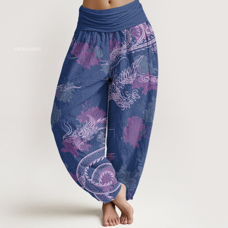 Design: The harem pants feature a design of Dragons, Roses, Auspicious Clouds, and Phoenix, symbolizing power, beauty, and harmony. The dragon represents strength and good fortune, while the phoenix embodies renewal and femininity; together with the roses signifying love and the clouds representing auspiciousness, this intricate pattern celebrates the balance of yin and yang, reflecting a rich tapestry of cultural significance and spiritual connection.