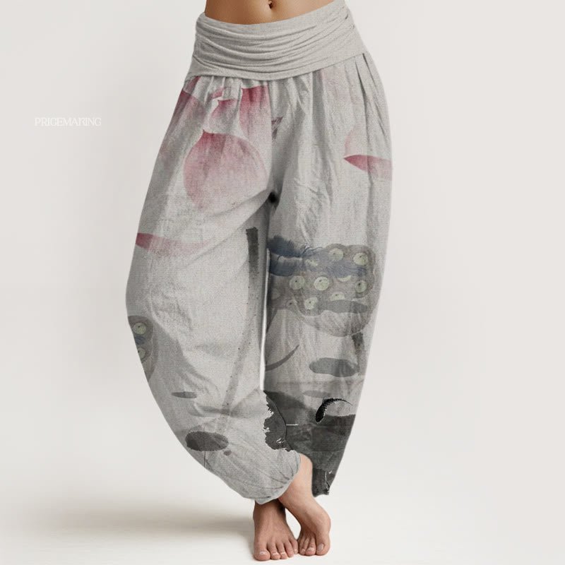 Design: The harem pants feature ink lotus, lotus leaves, and koi fish patterns. Lotus represents purity, nobility, and elegance, while koi fish symbolizes good luck, wealth, and success in Chinese culture. These elements reflect the aesthetic taste of traditional Chinese culture, making this pair of pants not only fashionable but also full of meaning.