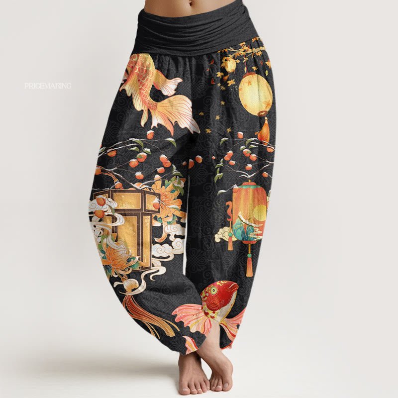 Design: The harem pants featuring koi fish, chrysanthemums, lanterns, and fruit trees symbolize prosperity, longevity, and the abundance of life. Koi fish represent perseverance and success, while chrysanthemums signify rejuvenation; the lanterns evoke illumination and guidance, and the fruit trees symbolize growth and fertility, together encouraging wearers to embrace a life filled with joy, richness, and positive energy.