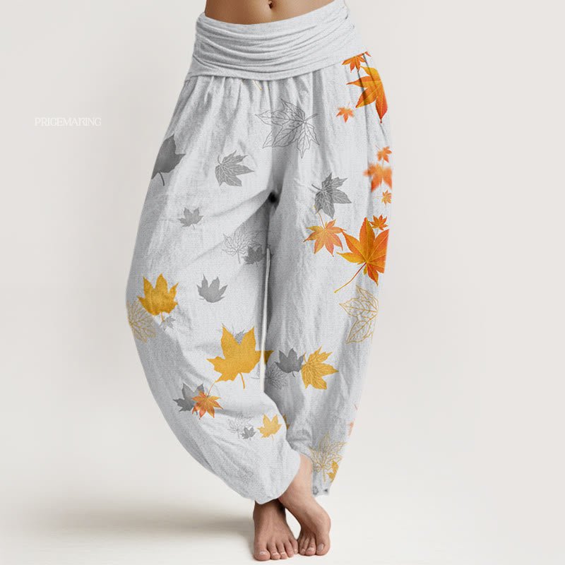 Design: The harem pants feature a design that includes many brown and gray maple leaf patterns, symbolizing resilience and the beauty of nature. This design reflects the changing seasons and the importance of embracing transformation, making it a stylish reminder of life's cycles and the strength found in adaptability.
