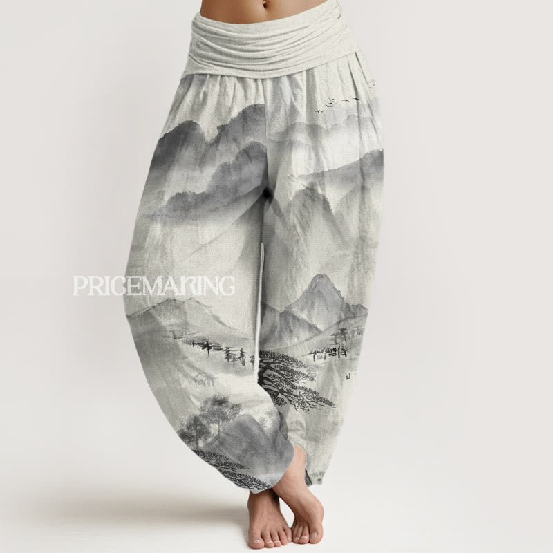 Landscape Ink Painting Harem Pants feature a tranquil design inspired by nature, depicting mountains and trees in elegant ink painting style. Made from breathable fabric, these pants offer comfort and flexibility. The elastic waistband provides a secure fit while maintaining ease of movement. Ideal for those seeking a deep connection with nature and mindfulness, they promote peace and serenity in everyday life.💕