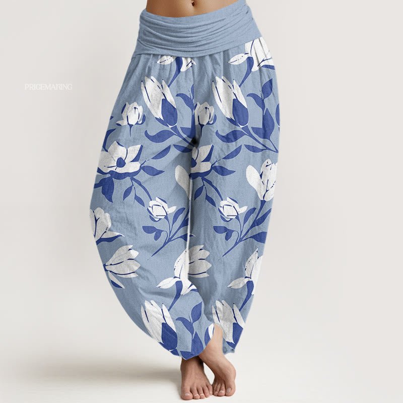 Retro Magnolia Harem Pants feature delicate white magnolia flowers on breathable, lightweight fabric. The elastic waistband ensures a secure, comfortable fit, while the flowy design allows for unrestricted movement. Ideal for yoga, meditation, or relaxation, these pants symbolize purity and grace, offering a calming presence and balance to your practice or daily activities.💕