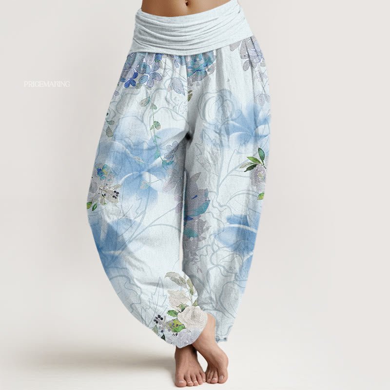 Design: The harem pants feature a design of various flowers and leaves, symbolizing beauty, growth, and the vibrant diversity of nature. This floral pattern celebrates the interconnectedness of life and the natural world, evoking a sense of freshness and positivity while adding a touch of elegance to the garment.