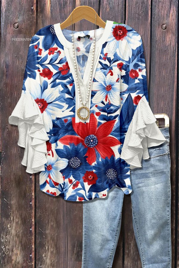 Chic Floral Print Ruffle Sleeve Patriotic Top