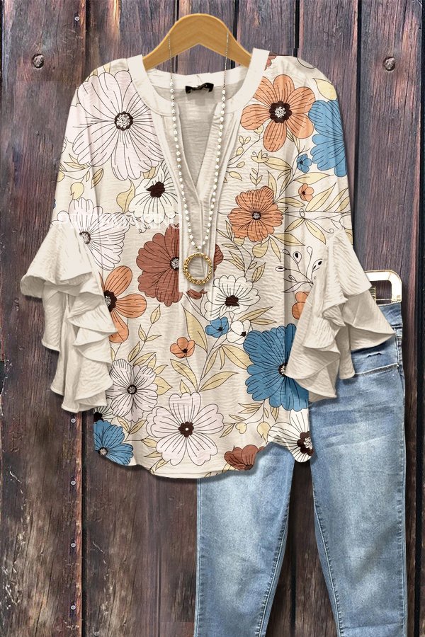 Classic Floral Print V-Neck Ruffle Sleeve Top