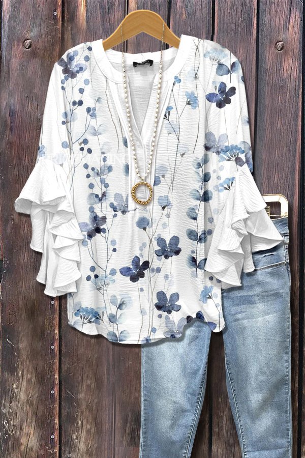 Elegant Floral Print Ruffle Sleeve Top