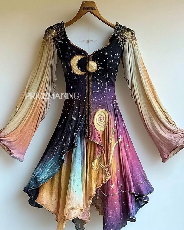 Holiday handmade color matching star and moon embroidery irregular dress c5fe