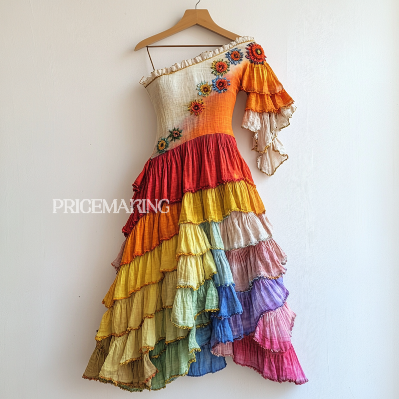 Rainbow Stitching Floral Embroidery Ruffle Dress f3f7