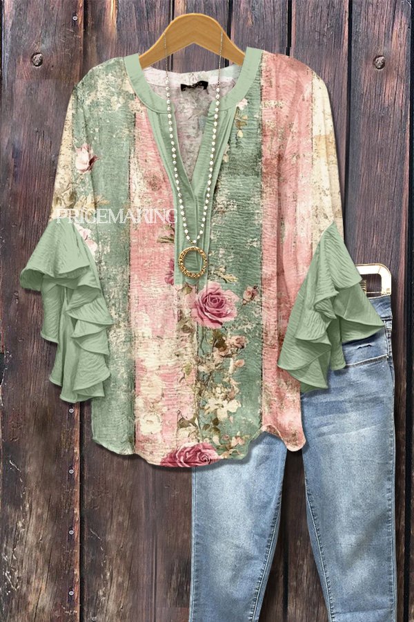 Retro Contrast Floral Print Ruffle Sleeve Top