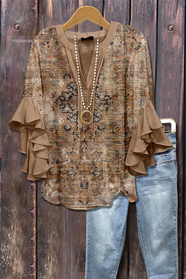 Retro Ethnic Print Ruffle Sleeve Top