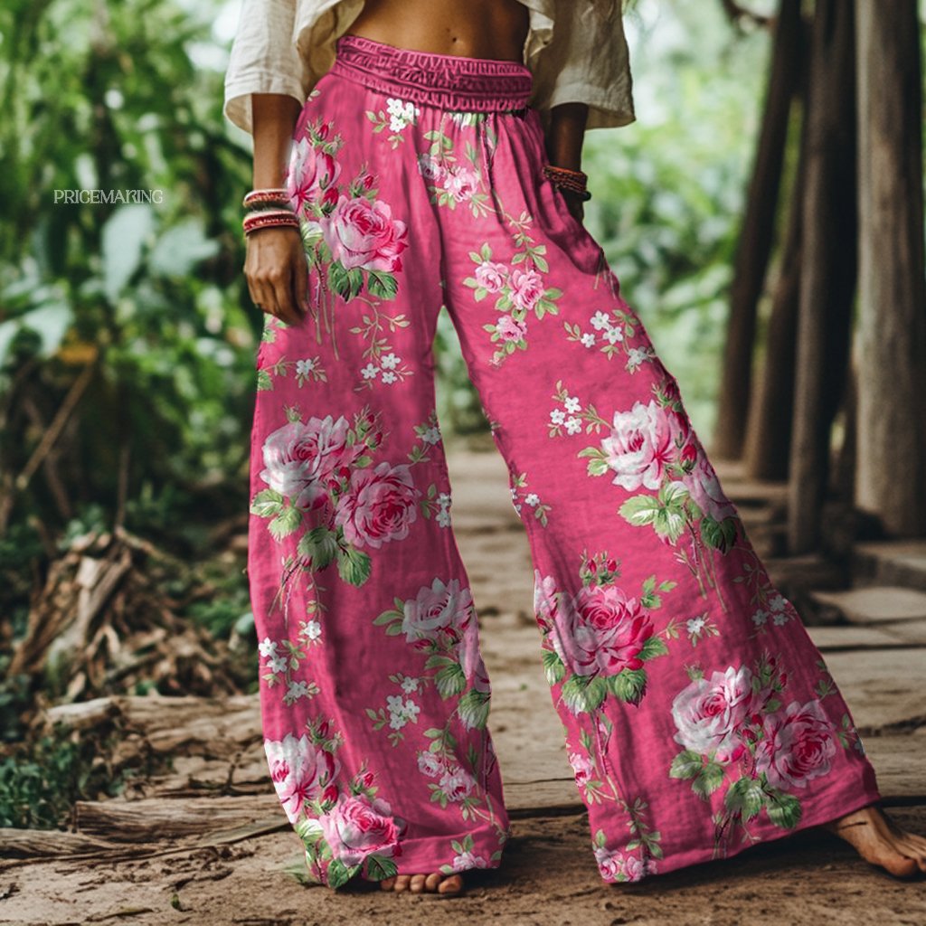 Vintage Pink Rose Floral Print Loose Wide-leg Pants