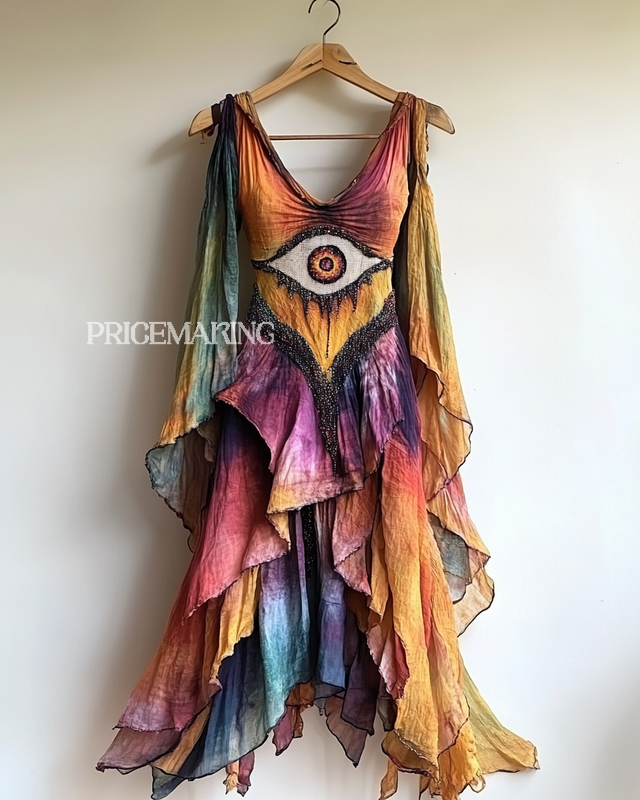Vacation Evil Eye Handmade Color-Blocking Rainbow Irregular Maxi Dress 4592