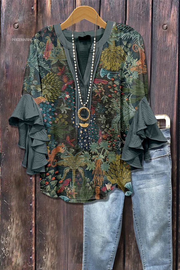 Vintage Botanical Print V-Neck Top
