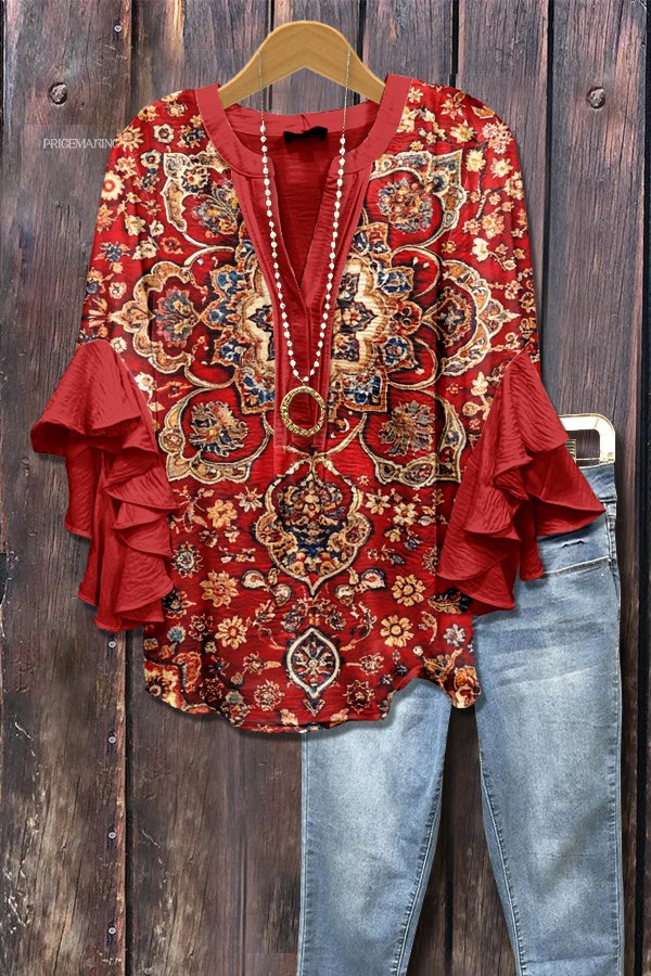 Vintage Ethinc Print Ruffle Sleeve Top