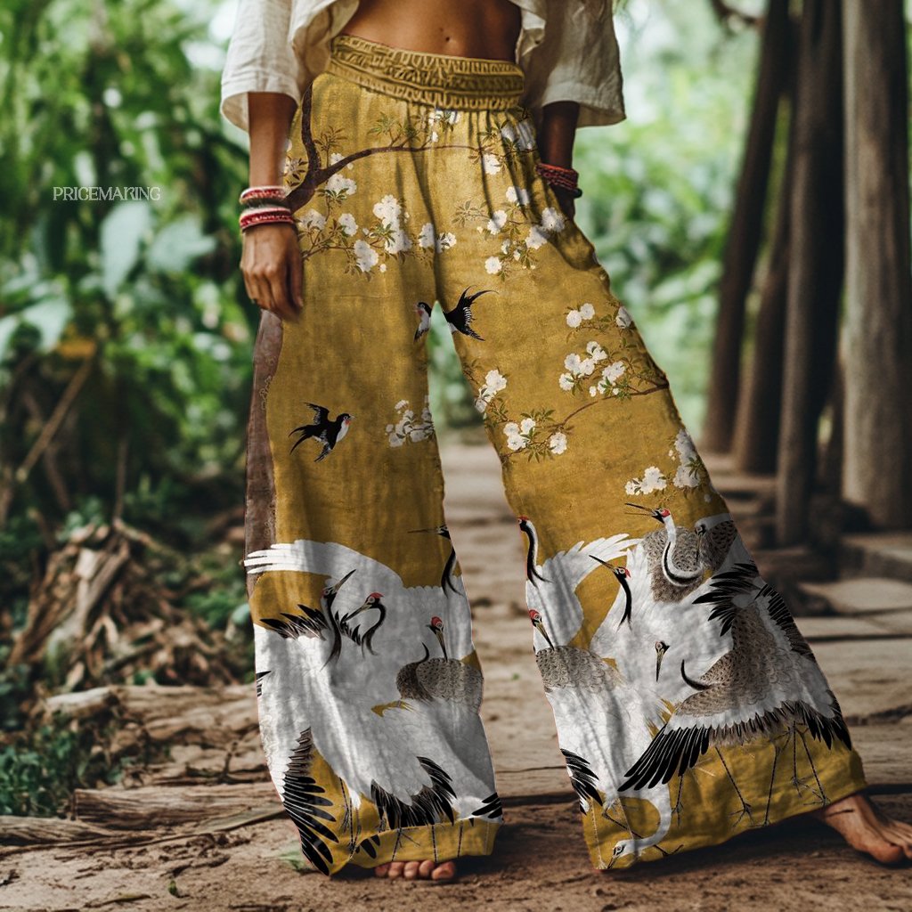 Vintage Floral Crane Art Print Loose Pants